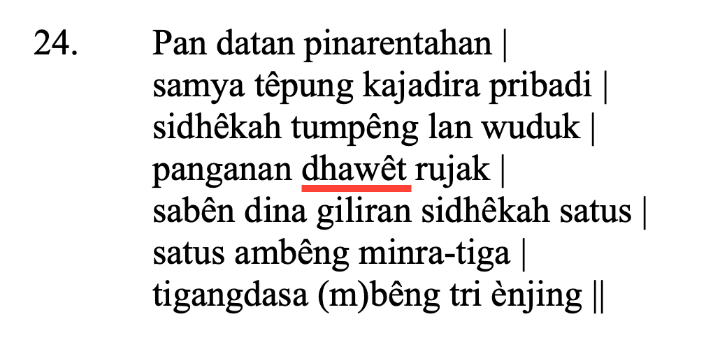 dhawêt (Daw|t) : kn ar. ombèn-ombên (santên karo juruh dicampuri tape lsp). Sumber: Bausastra Jawa, Poerwadarminta, 1939, #75.