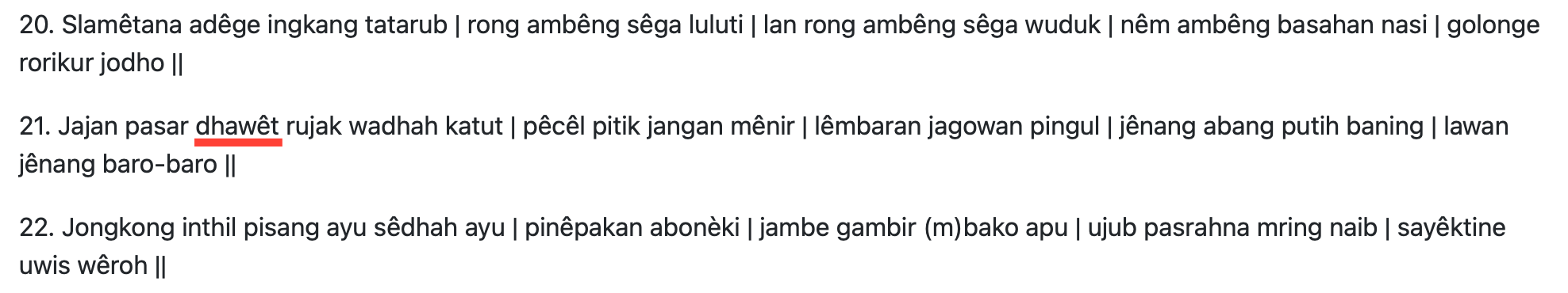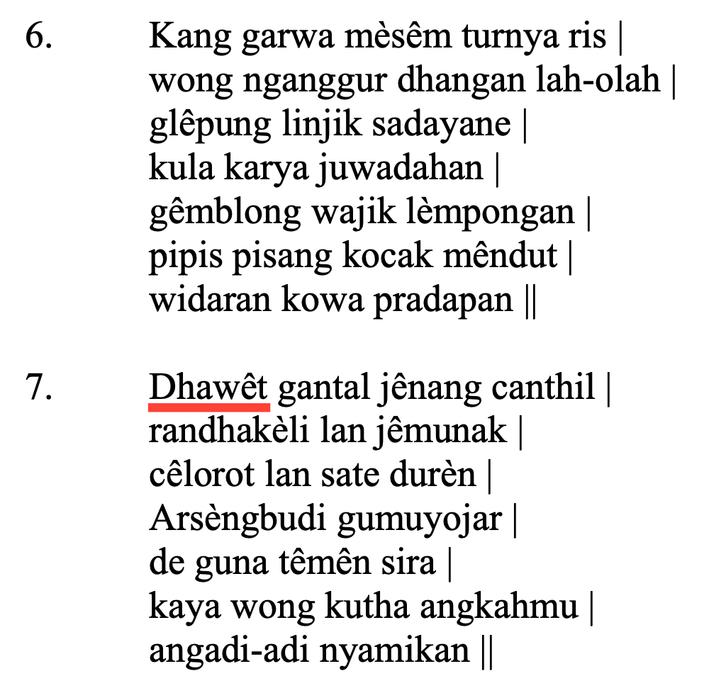 "Gajah waŋkaynya… anarasah dawet lwirnyatumpuk gila-gila kasatan kapanasan.”